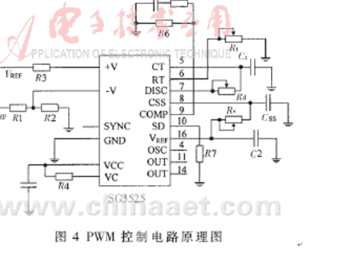 在以IGBT設(shè)計(jì)的逆變電源中,PWM控制電路是極其重要的組成部分,SG3525脈寬調(diào)制型控制器作為SG3524的改進(jìn)型,更適合于開(kāi)關(guān)器件的雙端DC-DC變換器,它的外圍電路原理圖如圖4所示,輸出波形如圖5所示。