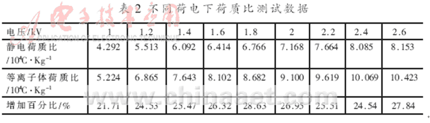 荷質(zhì)比是衡量霧滴荷電性能的重要指標(biāo),荷質(zhì)比越大,霧滴的荷電性能及充電效果越好,通過(guò)實(shí)驗(yàn)手段可對(duì)霧滴荷電情況進(jìn)行測(cè)量。不同荷電情況下荷質(zhì)比測(cè)試數(shù)據(jù)如表2所示。