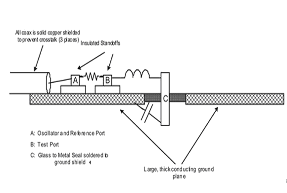 在諧振點(diǎn),低損耗的磁芯可以看成L-C共振回路。此時(shí)損耗可以等效為一個(gè)純阻元件(包括線圈損耗和磁芯損耗)。在上面的測(cè)試設(shè)備中,端子A和R都連接著50Ω電阻。此設(shè)備的開路(不包括電感)等效為150Ω負(fù)載的振蕩器。在網(wǎng)絡(luò)分析儀上可以表示為:
