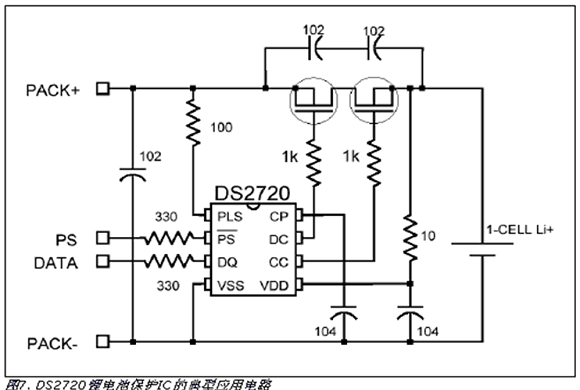 因為Li+電池過充或過放可能會導(dǎo)致爆炸并造成人員傷害,所以使用這類電池時,安全是主要關(guān)心的問題。因此,商用鋰離子電池組通常包括象DS2720這樣的保護電路(圖7)。
