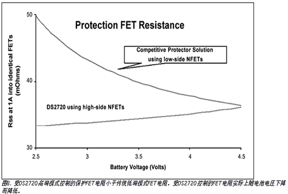 DS2720IC使用外部開關(guān)元件,如低成本n溝道功率MOSFET,來控制充電和放電電流。內(nèi)部9V的電荷泵為外部n溝道MOSFET提供高端驅(qū)動,與常見使用相同F(xiàn)ET的低端保護電路相比具有更低的導(dǎo)通電阻。FET導(dǎo)通電阻實際上隨電池放電而減少(見圖8)。