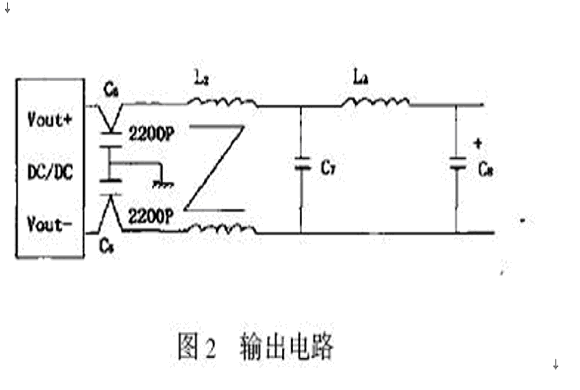 二次電源的輸出高頻噪聲(表現(xiàn)為紋波)可能向空間輻射成為輻射噪聲,過大時(shí)造成作為負(fù)載的電子設(shè)備出現(xiàn)故障。為此,二次直流電源的輸出應(yīng)包括平滑電路和EMI濾波電路。電路圖如圖2所示。