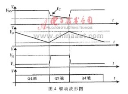 由于加速電容C4的作用,實際工作時,MOSFET的柵-源極輸入脈沖的下降沿非常陡,且又由于柵-源極輸入電容的作用,使VGS 波形具有一定的斜率,這有利于MOSFET的飽和導通。圖4為驅(qū)動波形。