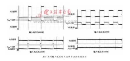圖5為當輸出電壓為10V、電流為2A時,在不同輸入電壓狀態(tài)下,圖3中A點和B點的實測波形。由圖5可知,當輸入電壓為13V時,MOSFET關(guān)斷時間很短,當輸入電壓為10V時,MOSFET則一直導通。