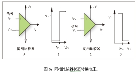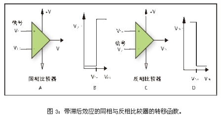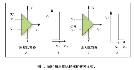 圖1B和1D給出了比較器電路的轉(zhuǎn)換函數(shù)。同相比較器被定義為在輸入信號大于門限電壓時輸出為正的比較器,而反相比較器被定義為輸入信號大于門限電壓時輸出為負(fù)的比較器。