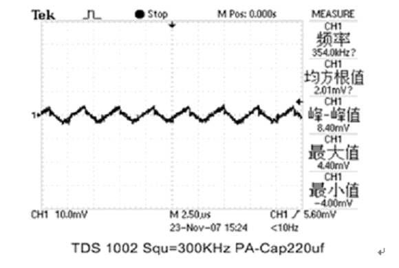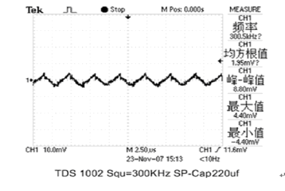 現(xiàn)分別用1只2V/220μF PA-Cap或2V/220μF松下公司聚合物固體疊層鋁電解電容器(SP-Cap)接在輸出電容Cout位置,測試其濾波效果。輸出波形如圖4和圖5所示: