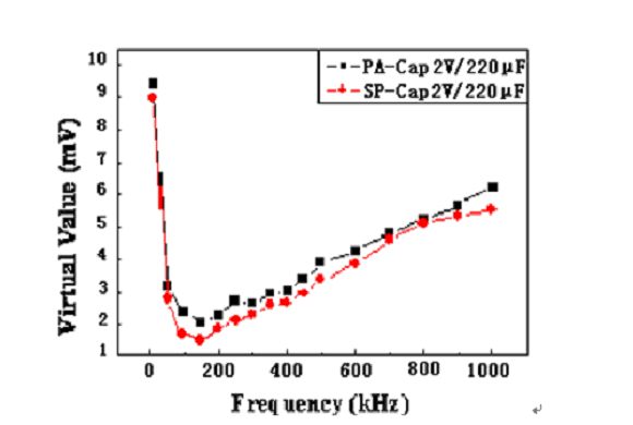 如上面的濾波效果顯示,當開關(guān)電源頻率在300KHz左右時,同種規(guī)格的PA-Cap的輸出均方根與SP-Cap的很接近,所以PA-Cap濾波效果基本接近于SP-Cap。由于具有低的ESR、允許的紋波電流大,所以PA-Cap也是DC/DC轉(zhuǎn)換器或開關(guān)電源輸出電容的優(yōu)選電容之一。