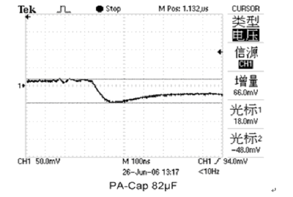 當MPU的負載電流急劇增大時,由于PA-Cap的ESR比普通鉭電容小很多,所以接上PA-Cap的電源電壓下降只有66mV比普通鉭電容小好幾倍(如圖10、11所示),達到良好的去耦效果。PA-Cap不僅去耦效果好,而且不燃燒不爆炸,是MPU等數(shù)字電路作為高速保護備用電荷庫的優(yōu)選電容之一。