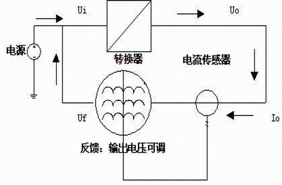 在能量反饋部分就要能實(shí)現(xiàn)上述要求,保證穩(wěn)定的電能轉(zhuǎn)換器的輸出電流,采用電流傳感器檢測電能轉(zhuǎn)換器的輸出電流,同時(shí)反饋部分采用反饋電壓與輸出控制電流之間成反比系數(shù)關(guān)系即Uf∝K/Io,為便于分析,設(shè)電源電壓Ui為穩(wěn)定值。當(dāng)輸出電流較小時(shí),通過調(diào)節(jié)反饋電壓,使其變大,則反饋電壓與輸入的電壓差△U=Uf-Ui變大, 相應(yīng)的由反饋電壓流向輸入電壓的電流加大,造成相應(yīng)的反饋功率加大;當(dāng)輸出電流較大時(shí),通過調(diào)節(jié)反饋電壓,使Uf變小,則反饋電壓與輸入的電壓差△U變小,相應(yīng)的由反饋電壓流向輸入電壓的電流減小,造成循環(huán)的功率減??;整個過程維持負(fù)反饋控制,最終達(dá)到動態(tài)平衡,維持設(shè)定的額定功率。