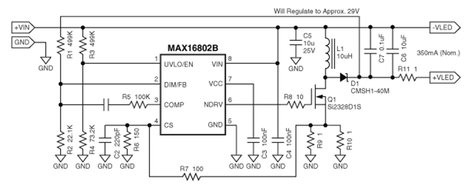 步驟6:R1和R2可選。它們用于調(diào)整+VLED至29V。這在輸出端出現(xiàn)意外開路時(shí)非常有用。如果沒有上述元件的分壓,輸出電壓有可能上升,導(dǎo)致器件損壞。
