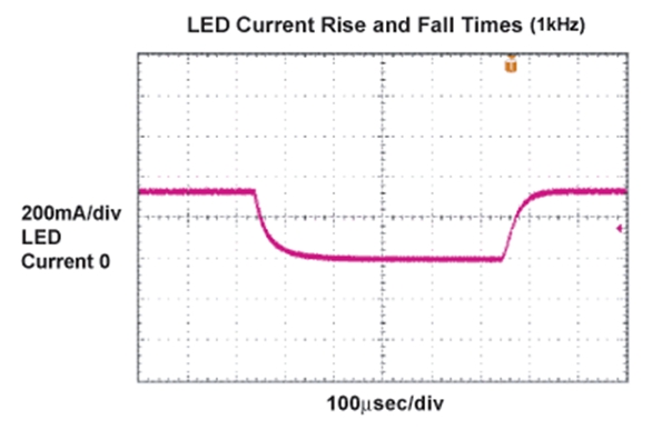 控制LED燈源亮度的最好辦法是通過(guò)一個(gè)低頻PWM脈沖調(diào)制LED電流。使用這種方法,LED電流根據(jù)占空比的變化觸發(fā)脈沖,同時(shí)保持電流幅度恒定。這樣,器件發(fā)出的光波波長(zhǎng)在整個(gè)調(diào)節(jié)范圍內(nèi)保持不變。