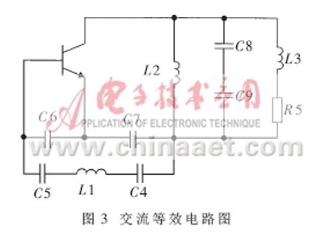 交流等效電路如圖3所示。L1、C4和C5串聯(lián)可以等效成一個電感,從而滿足電容三端振蕩器的相位條件。L1、C4、C5、C6、C7構(gòu)成了諧振回路,振蕩頻率主要由這五個元件所決定。頻率計算公式如下: