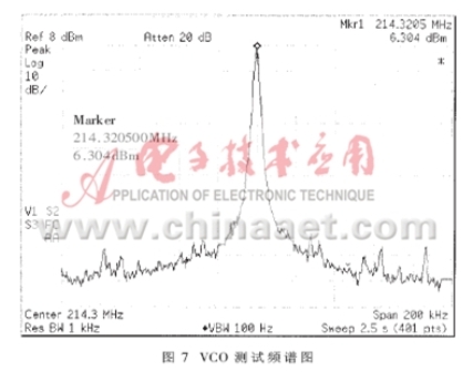 L3和輸出回路的C8、C9、L2可以構(gòu)成等效電感LC,從而進(jìn)行相角補(bǔ)償,使得振蕩器工作在LC回路的諧振頻率上。當(dāng)輸出回路等效為電容時,通過實際測量,在頻率214.64859MHz上的穩(wěn)定度為9.3631e-4;而等效為電感時,在214.26046MHz上的穩(wěn)定度為4.2278e-4??梢娪玫刃щ姼羞M(jìn)行相角補(bǔ)償后,穩(wěn)定度大約提高了一倍。C8、C9和L2同時構(gòu)成了輸出網(wǎng)絡(luò),對高次諧波有很好的抑制作用,并使基波輸出功率平坦化。