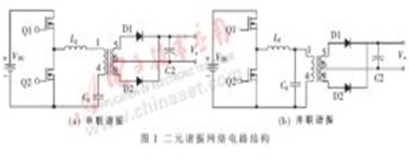 用兩個元件組成的諧振拓樸結(jié)構(gòu)主要有兩種:并聯(lián)結(jié)構(gòu)和串聯(lián)結(jié)構(gòu),分別如圖1(a)和圖1(b)所示。串聯(lián)諧振在輕負載時具有較高的效率,而在滿負載時轉(zhuǎn)換效率比較低;并聯(lián)諧振則反之,在滿負載時具有較高的轉(zhuǎn)換效率,而在輕負載時轉(zhuǎn)換效率比較低。而且串聯(lián)諧振和并聯(lián)諧振都要求較寬的頻率范圍。因此,這種二元的諧振網(wǎng)絡在實際應用中都有一定的限制。