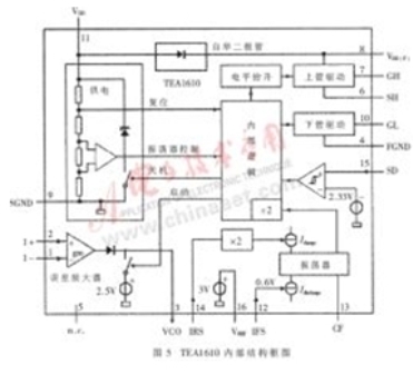 TEA1610是Philips公司推出的零電壓全諧振半橋控制器,是采用高壓DMOS工藝的芯片,高側(cè)開關管的驅(qū)動耐壓最大可達600V,最大的振蕩頻率達1MHz。其內(nèi)部結(jié)構(gòu)如圖5所示。