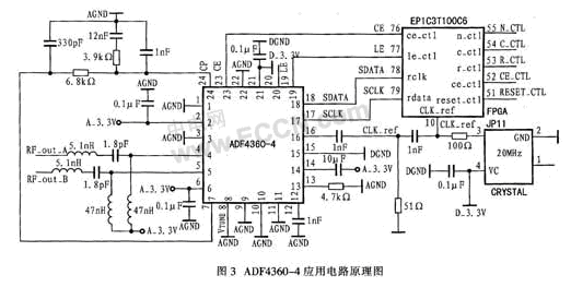 圖3是利用ADF460-4作為混頻器本振的外圍電路。外部晶體振蕩器為20 MHz,具有高穩(wěn)定性。該晶體振蕩器不僅為ADF4360-4提供參考頻率,還為控制ADF4360-4的FPGA器件提供時鐘。晶體振蕩器接ADF4360-4的參考時鐘輸入引腳CLK_ref,在內(nèi)部電荷泵輸出引腳CP和VCO輸出引腳VTUNE之間接入環(huán)路濾波電路。