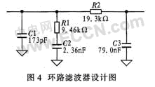 三階環(huán)路濾波電路如圖4所示,PFD的相位檢測頻率fr=200 kHz,相位裕量φp=45°,由于外接晶體振蕩頻率源為20 MHz,所以計算出參考分頻比N=100,利用ADI公司提供的ADIsimPLL工具計算三階環(huán)路濾波器參數(shù):R1=9.46 kΩ,C1=173 pF,C2=2.36 nF,R2=19.3 kΩ,C3=79 pF。