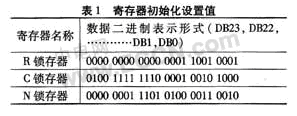 主分頻比N=1.5 GHz/200 kHz=7 500 。需要注意的是:雙模前置分頻器(P/P+1)輸出頻率要求小于300 MHz。因此選擇P/P+1=16/17,根據(jù)N=BF+A(A、B為整數(shù)),得到A=12,B=468。3個24位鎖存器的初始化設(shè)置如表1所示。