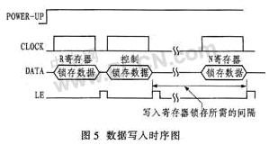 數(shù)據(jù)寫入時序:DATA在每個CLOCK的上升沿從MSB(最高有效位)開始依次寫入24位移位寄存器中的數(shù)據(jù)并一次鎖存到目標(biāo)寄存器,再開始下一個目標(biāo)寄存器的初始化。目標(biāo)寄存器選取由移位寄存器中的DB1、DB0決定。對寄存器賦值順序為R,C、N。C寄存器和N寄存器賦值間隔應(yīng)大于5 ms,數(shù)據(jù)寫入時序如圖5所示。