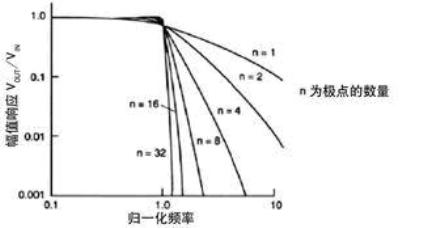 圖1 幾個低通濾波器的幅值響應與歸一化頻率的關(guān)系曲線。如果濾波器傳遞函數(shù)有多個極點(或階數(shù)),則頻率越高,衰減越快。
