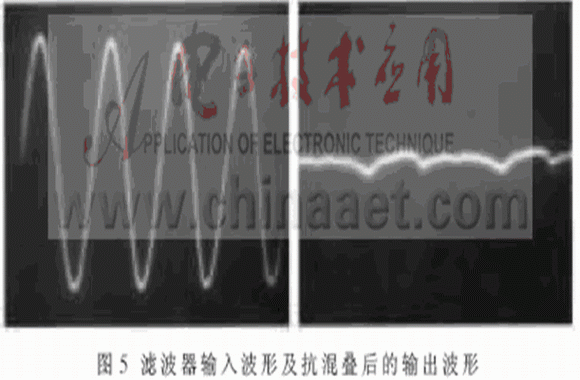 實驗觀察得知,經(jīng)過開關(guān)電容濾波后的信號存在較多的“毛刺”和“陰影”。分析發(fā)現(xiàn),這主要是高頻混疊所致。本文作者通過大量的實驗探索提出了在開關(guān)電容帶阻濾波電路的輸出端接入抗混疊濾波器的精簡解決方法,采用一階低通濾波器實現(xiàn)抗混疊濾波。同時,接入的抗混疊濾波器還起到消除開關(guān)噪聲、時鐘噪聲等高頻干擾和平滑濾波的目的。濾波器輸入波形及輸出波形如圖5所示。