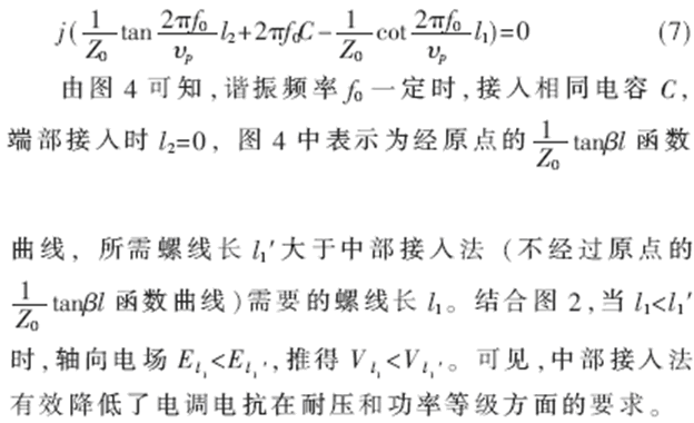 由圖2可知,軸向電場能量以sin2βz形式分布,開路端電場能量最為集中。端部加載時,加載電抗將不得不承受高電壓。例如,Qu=6000、30MHz、3dB帶寬為50kHz的螺旋濾波器,在RL=50Ω,傳輸功率45kW時,螺線端部電壓將達75kV。這給電調(diào)器件提出了相當高甚至難以達到的耐壓要求。