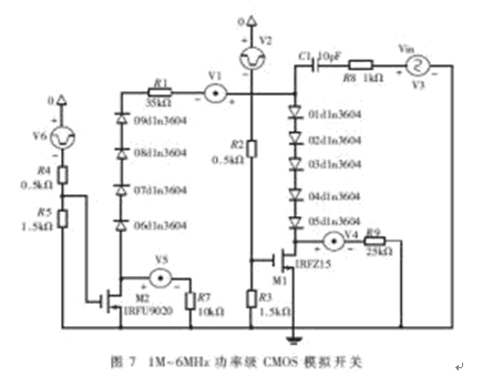 對約束VDD≥Vin≥VSS作深入分析可知,Vin之所以取值有限,根本原因在于其與V柵-襯底的關聯(lián)。使V柵-襯底獨立,避免Vin、Vout的影響,反過來將讓Vin輕松擺脫束縛。為此,本節(jié)設計了接地形CMOS傳輸門。原理電路如圖6(b)所示,具體的1M~6MHz高頻、功率級模擬開關電路見圖7。