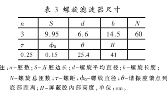 調(diào)頻范圍1.5M~3MHz;通帶中心插耗A0≤3dB;25dB帶寬△f25dB≥25kHz; 終端負載RS=RL=50Ω;傳輸功率P=100W。采用等元型螺旋濾波器設計法[6]確定的方腔螺旋腔濾波器腔數(shù)及尺寸見表3,測試結(jié)果見圖9、10及表4。