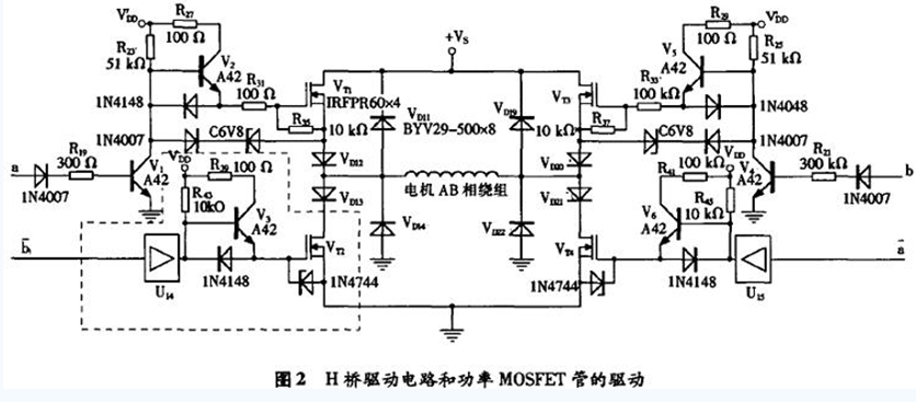 功率MOSFET管有內(nèi)接的快恢復二極管。當不接VD11,VD12,VD13,VD14時,假定此時電機AB相繞組由VT1管(和VT4管)驅(qū)動,即VT2管(和VB)截止,VT1管(和VT4管)導通,電流經(jīng)VT1管流過繞組。當下一個控制信號使VT1管關(guān)斷時,負載繞組的續(xù)流電流經(jīng)VT2的內(nèi)接快恢復二極管從地獲取。此時,VT2管的漏源電壓即是該快恢復二極管的通態(tài)壓降,為一很小的負值。當VT1再次導通時,該快恢復二極管關(guān)斷,VT2的漏源電壓迅速上升,直至接近于正電源的電壓+VS,這意味著VT2漏源間要承受很高且邊沿很陡的上升電壓,該上升電壓反向加在VT2管內(nèi)的快恢復二極管兩端,會使快恢復二極管出現(xiàn)恢復效應,即有一個很大的電流流過加有反向電壓的快恢復二極管。為了抑制VT2管內(nèi)的快恢復二極管出現(xiàn)這種反向恢復效應,在圖2電路中接人了VD11,VD12,VD13,VD14。其中,反并聯(lián)快恢復二極管VD11,VD14的作用是為電機AB相繞組提供續(xù)流通路,VD12,VD13是為了使功率MOSFET管VT1,VT2內(nèi)部的快恢復二極管不流過反向電流,以保證VT1,VT2在動態(tài)工作時能起正常的開關(guān)作用。VD19,VD20,VD21,VD22的作用亦是同樣的道理。