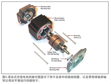 混合式步進電機結(jié)合了永磁和開關(guān)磁阻電機的工作原理,在轉(zhuǎn)子軸上裝有一對或多對外圓周有很多齒的定子疊片,在每對定子疊片間有一個永磁體,會在軸向上生成北極和南極。齒的數(shù)量、電機結(jié)構(gòu)與驅(qū)動方案等幾項因素確定了電機的步進角度,多數(shù)應(yīng)用指定了混合式步進電機1.8°的步長(每轉(zhuǎn)200步長)(見參考資料)。