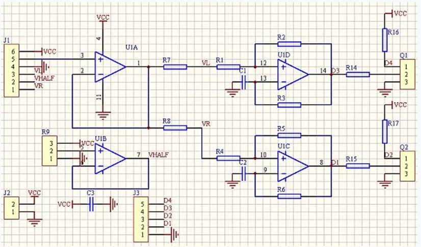 上圖為一個(gè)使用游戲手柄或者航模搖桿上的線性電位器(或線性霍爾元件)控制兩個(gè)底盤驅(qū)動(dòng)電機(jī)的PWM生成電路。J1是手柄的插座,123和456分別是x,y兩個(gè)方向的電位器。U1B提供半電源電壓,U1A是電壓跟隨。x,y分量經(jīng)過(guò)合成成為控制左右輪兩個(gè)電機(jī)轉(zhuǎn)速的電壓信號(hào)。在使用中,讓L=(x+1)y/(x+1。4),R=(x-1)y/(x-0。6),經(jīng)過(guò)試驗(yàn)有不錯(cuò)的效果(數(shù)字只是單位,不是電壓值)。經(jīng)過(guò)U1C和U1D組成的施密特振蕩器把電壓轉(zhuǎn)換為相應(yīng)的PWM信號(hào),用來(lái)控制功率驅(qū)動(dòng)電路。以U1D為例,R1,R2組成有回差的施密特電路,上下門限受輸入電壓影響,C1和R3組成延時(shí)回路,如此形成振蕩的脈寬受輸入電壓控制。Q1,Q2是三極管,組成反相器,提供差分的控制信號(hào)。具體振蕩過(guò)程參見(jiàn)對(duì)555振蕩器的分析。