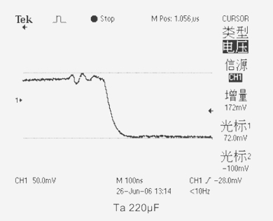 3、當(dāng)測試電容為(Ta)鉭電解電容器CT=220μF ESR=73mΩ時,輸出電壓下跌值為172mV。