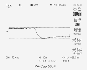 4、當(dāng)測試電容采用(PA-Cap)聚合物片式疊層鋁電解電容器CT=56μF ESR=23mΩ時,輸出電壓下跌值為90mV。
