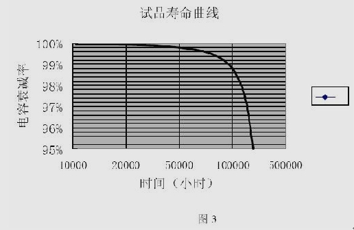 根據(jù)上述因素,鋁電解電容器在中、高頻環(huán)境下使用故障率非常高、壽命非常短,額定工況下預(yù)期壽命≤50000小時(如圖3),隨著工況的變化容量急劇變化,壽命降低,甚至由一些企業(yè)在中、高頻環(huán)境使用鋁電解電容器壽命不足10000小時,常常由于電容器故障影響到整臺設(shè)備的使用。相反金屬化電容器在中、高頻環(huán)境使用,由于其良好的頻率、電流特性可以保證其安全長壽命,在額定工況下預(yù)期壽命≥80000小時,且在壽命期內(nèi)隨環(huán)境的變化電氣性能基本保持不變,不影響電容器的壽命(如圖3),保證配套設(shè)備運行安全可靠。
