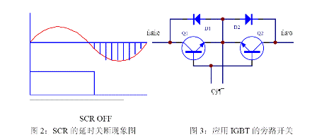 旁路開關(guān)常使用繼電器和可控硅。繼電器在中小功率的UPS 中廣泛應(yīng)用。優(yōu)點(diǎn)是控制簡(jiǎn)單,成本低,缺點(diǎn)是繼電器有轉(zhuǎn)換時(shí)間,還有就是機(jī)電器件的壽命問題??煽毓璩R娪谥写蠊β蔝PS 中。優(yōu)點(diǎn)是控制電流大,沒有切換時(shí)間。但缺點(diǎn)就是控制復(fù)雜,且由于可控硅的觸發(fā)工作特性,在觸發(fā)導(dǎo)通后要在反向偏置后才能關(guān)斷,這樣就會(huì)產(chǎn)生一個(gè)最大10ms 的環(huán)流電流,如圖2。如果采用IGBT,如圖3,則可以避免這個(gè)問題,使用IGBT 有控制簡(jiǎn)單的優(yōu)點(diǎn),但成本較高。其工作原理為:當(dāng)輸入為正半周時(shí),電流流經(jīng)Q1、D2,負(fù)半周時(shí)電流流經(jīng)D1、Q2。