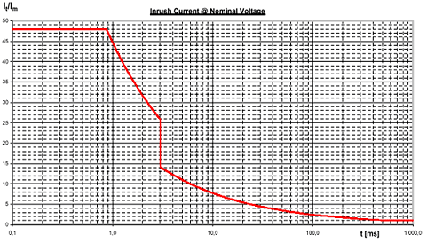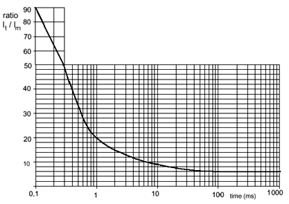 歐洲電信標準協會(the European Telecommunications Standards Institute)對用于通信系統(tǒng)的開關電源的沖擊電流大小做了規(guī)定,圖3為通信系統(tǒng)用AC/DC電源供電時的最大沖擊電流限值[4],圖4為通信系統(tǒng)在DC/DC電源供電,標稱輸入電壓和最大輸出負載時的最大沖擊電流限值[5]。圖中It為沖擊電流的瞬態(tài)值,Im為穩(wěn)態(tài)工作電流。