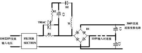 在這種可控硅啟動電路中,很容易通過開關電源主變壓器上的一個線圈來給可控硅供電。由開關電源的緩啟動來提供可控硅的延遲啟動,這樣在電源啟動前就可以通過電阻R1將輸入電容充滿電。