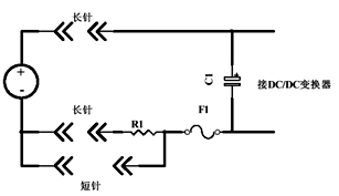 圖7所示電路為長短針法沖擊電流限制電路,在DC/DC電源板插入時,長針接觸,輸入電容C1通過電阻R1充電,當電源板完全插入時,電阻R1被斷針短路。C1代表DC/DC電源的所有電容量。