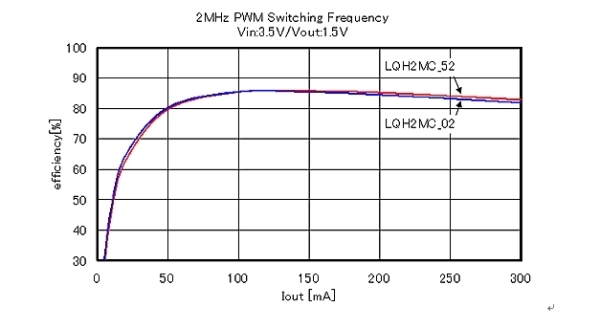 圖3展示了降壓型DC-DC轉(zhuǎn)換器使用時(shí),使用LQH2MCN2R2M02及LQH2MCN2R2M52時(shí)的電源電壓變換效率的評(píng)價(jià)結(jié)果。LQH2MC_52系列雖最大厚度只有0.7mm的小型化產(chǎn)品,但卻和最大0.95mm厚的LQH2MC_02系列一樣,達(dá)到了很高的電源電壓變換效率。