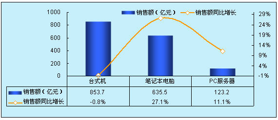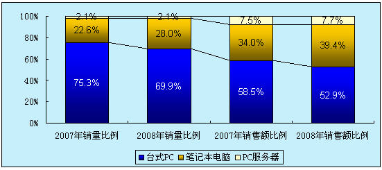等行業(yè)對IT集中采購出現(xiàn)延后,部分中小企業(yè)資金也出現(xiàn)問題,采購有所停滯,不過,相比較其他IT硬件產(chǎn)品而言,筆記本電腦受影響程度相對較小,增速繼續(xù)領(lǐng)跑。據(jù)賽迪顧問統(tǒng)計(jì),2008年,中國筆記本市場銷售量為901.8萬臺,同比增長43.2%,銷售額達(dá)到635.5億元,同比增長為27.1%。
