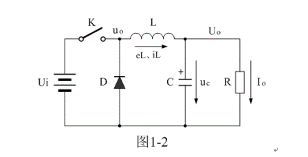 圖1-2是在圖1-1-a電路的基礎(chǔ)上,增加了一個(gè)整流二極管和一個(gè)LC濾波電路。其中L是儲(chǔ)能濾波電感,它的作用是在控制開關(guān)K接通期間Ton限制大電流通過,防止輸入電壓Ui直接加到負(fù)載R上,對(duì)負(fù)載R進(jìn)行電壓沖擊,同時(shí)對(duì)流過電感的電流iL轉(zhuǎn)化成磁能進(jìn)行能量存儲(chǔ),然后在控制開關(guān)K關(guān)斷期間Toff把磁能轉(zhuǎn)化成電流iL繼續(xù)向負(fù)載R提供能量輸出;C是儲(chǔ)能濾波電容,它的作用是在控制開關(guān)K接通期間Ton把流過儲(chǔ)能電感L的部分電流轉(zhuǎn)化成電荷進(jìn)行存儲(chǔ),然后在控制開關(guān)K關(guān)斷期間Toff把電荷轉(zhuǎn)化成電流繼續(xù)向負(fù)載R提供能量輸出;D是整流二極管,主要功能是續(xù)流作用,故稱它為續(xù)流二極管,其作用是在控制開關(guān)關(guān)斷期間Toff,給儲(chǔ)能濾波電感L釋放能量提供電流通路。