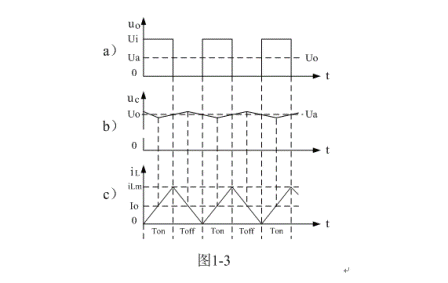 圖1-3、圖1-4、圖1-5分別是控制開關(guān)K的占空比D等于0.5、< 0.5、> 0.5時(shí),圖1-2電路中幾個(gè)關(guān)鍵點(diǎn)的電壓和電流波形。圖1-3-a)、圖1-4-a)、圖1-5-a)分別為控制開關(guān)K輸出電壓uo的波形;圖1-3-b)、圖1-4-b)、圖1-5-b)分別為儲(chǔ)能濾波電容兩端電壓uc的波形;圖1-3-c)、圖1-4-c)、圖1-5-c)分別為流過儲(chǔ)能電感L電流iL的波形。