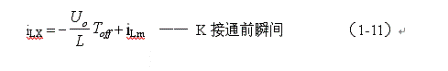 式中i(Ton+)為控制開關(guān)K從Ton轉(zhuǎn)換到Toff的瞬間之前流過電感的電流,i(Ton+)也可以寫為i(Toff-),即:控制開關(guān)K關(guān)斷或接通瞬間,之前和之后流過電感L的電流相等。實(shí)際上(1-8)式中的i(Ton+)就是(1-6)式中的iLm,即: