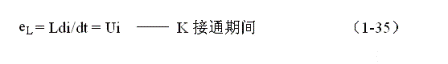 式中Ton為控制開(kāi)關(guān)K接通的時(shí)間。當(dāng)圖1-11-a中的控制開(kāi)關(guān)K由接通狀態(tài)突然轉(zhuǎn)為關(guān)斷時(shí),儲(chǔ)能電感L會(huì)把其存儲(chǔ)的能量(磁能)通過(guò)反電動(dòng)勢(shì)進(jìn)行釋放,儲(chǔ)能電感L產(chǎn)生的反電動(dòng)勢(shì)為: