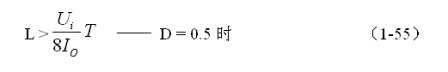 (1-54)和(1-55)式,就是計(jì)算并聯(lián)式開(kāi)關(guān)電源儲(chǔ)能電感的公式。同理,(1-54)和(1-55)式的計(jì)算結(jié)果,只給出了計(jì)算并聯(lián)開(kāi)關(guān)電源儲(chǔ)能濾波電感L的中間值,或平均值,對(duì)于極端情況可以在平均值的計(jì)算結(jié)果上再乘以一個(gè)大于1的系數(shù)。
