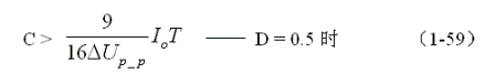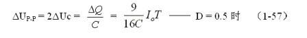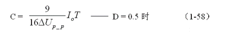 (1-58)和(1-59)式,就是計(jì)算并聯(lián)開(kāi)關(guān)電源儲(chǔ)能濾波電容的公式(D = 0.5時(shí))。式中:Io是流過(guò)負(fù)載電流的平均值,T為開(kāi)關(guān)工作周期,ΔUP-P為濾波輸出電壓的波紋,或電壓紋波。一般波紋電壓都是取電壓增量的峰-峰值,因此,當(dāng)D = 0.5時(shí),波紋電壓等于電容器充電的電壓增量,即:ΔUP-P = 2ΔUc 。
