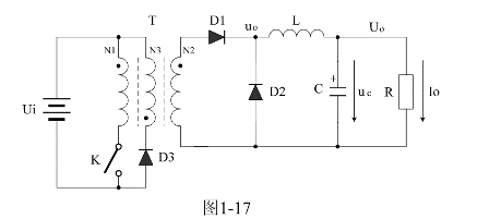 圖1-17是正激式變壓器開關(guān)電源的簡單工作原理圖,圖1-17中Ui是開關(guān)電源的輸入電壓,T是開關(guān)變壓器,K是控制開關(guān),L是儲能濾波電感,C是儲能濾波電容,D2是續(xù)流二極管,D3是削反峰二極管,R是負載電阻。