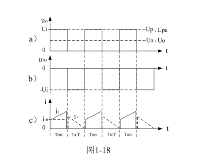 圖1-17中,在Ton期間,控制開關(guān)K接通,輸入電源Ui對變壓器初級線圈N1繞組加電,初級線圈N1繞組有電流i1流過,在N1兩端產(chǎn)生自感電動勢的同時,在變壓器次級線圈N2繞組的兩端也同時產(chǎn)生感應(yīng)電動勢,并向負載提供輸出電壓。開關(guān)變壓器次級線圈輸出電壓大小由(1-63)、(1-69)、(1-76)、(1-77)等式給出,電壓輸出波形如圖1-18-a)。