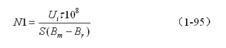 (1-95)式就是計算單激式開關(guān)電源變壓器初級線圈N1繞組匝數(shù)的公式。式中,N1為變壓器初級線圈N1繞組的最少匝數(shù),S為變壓器鐵心的導(dǎo)磁面積(單位:平方厘米),Bm為變壓器鐵心的最大磁感應(yīng)強度(單位:高斯),Br為變壓器鐵心的剩余磁感應(yīng)強度(單位:高斯),Br一般簡稱剩磁,τ = Ton,為控制開關(guān)的接通時間,簡稱脈沖寬度,或電源開關(guān)管導(dǎo)通時間的寬度(單位:秒),一般τ取值時要預(yù)留20%以上的余量,Ui為工電壓,單位為伏。式中的指數(shù)是統(tǒng)一單位用的,選用不同單位,指數(shù)的值也不一樣,這里選用CGS單位制,即:長度為厘米(cm),磁感應(yīng)強度為高斯(Gs),磁通單位為麥克斯韋(Mx)。