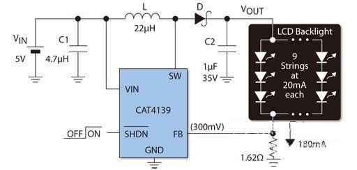 首先計(jì)算處理2W的負(fù)載需要多大的開關(guān)電流。假定效率為80%,輸入電流等于Vout×Iout/Vin×效率=10×0.18/5×0.8=450mA。CAT4139電感型升壓LED驅(qū)動(dòng)器具有750mA(最小值)的驅(qū)動(dòng)能力,故很適合于該應(yīng)用。